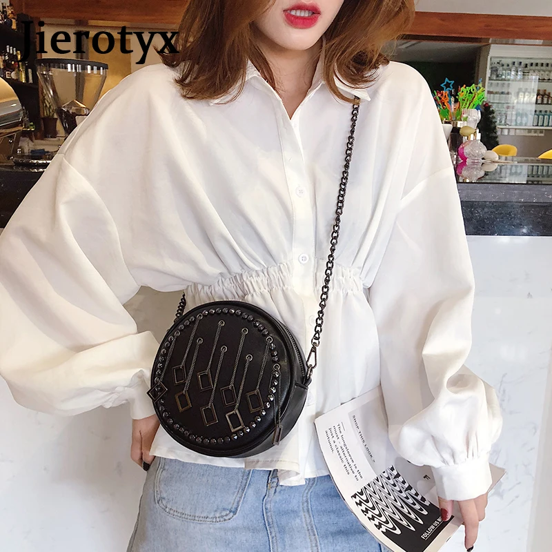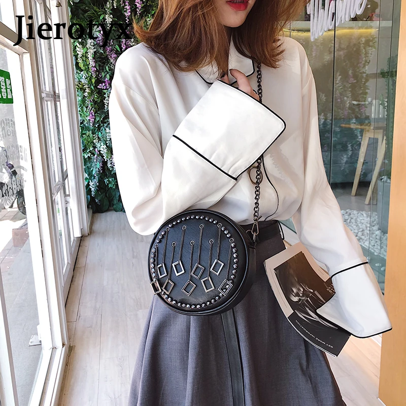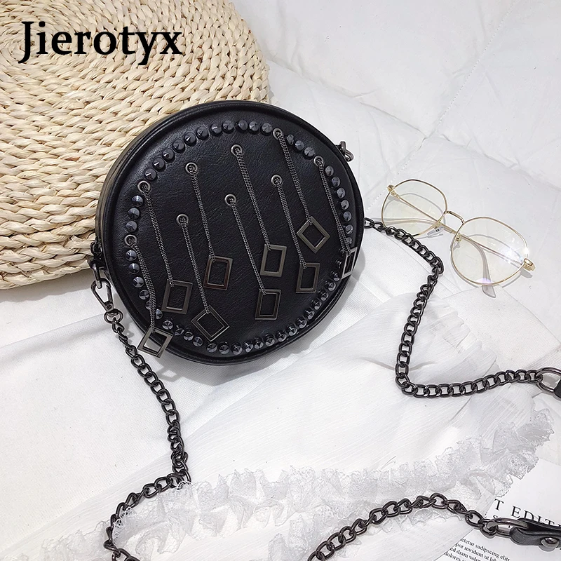 DISCOUNT definitely the JIEROTYX Black Punk Rivet PU Leather Crossbody Bags Women 2019 Fashion Round Chain Purses Handbags Travel Messenger Bag Clutche RECOMMENDED TODAY